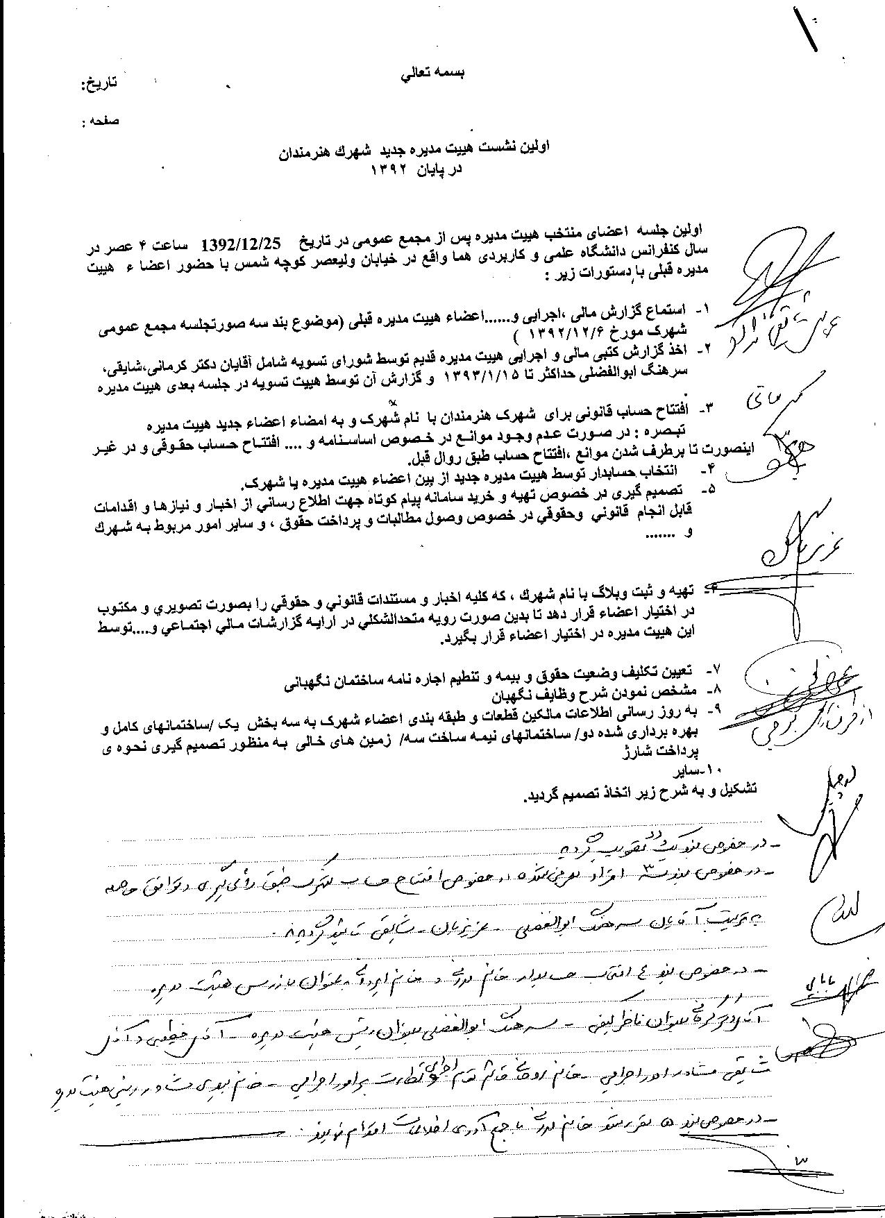 سومین جلسه هییت مدیره شهرک هنرمندان در تاریخ 25-1-93 ساعت 17  برگزار شد و تصمیمات ذیل اتخاذ گردید.